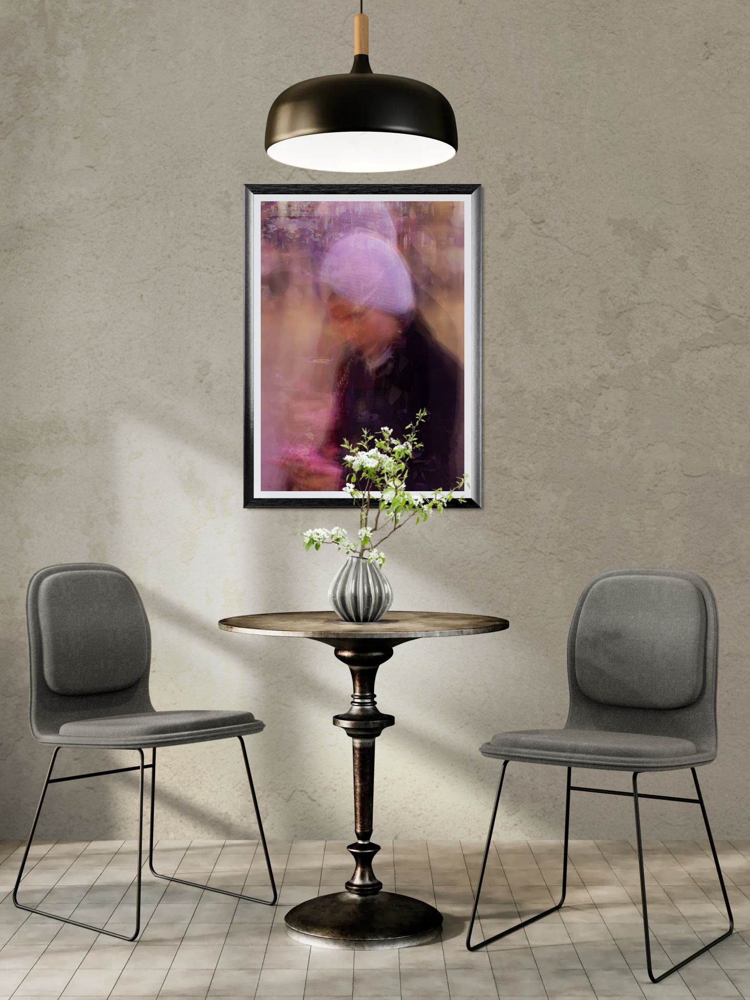 Hello Mum captures a tender and spontaneous moment on the bustling streets of Carnaby Street in London. This artwork features a candid interaction of a young woman on a phone call, perhaps reaching out to her mother “Hello, Mum, I’m in Carnaby Street”. The scene is rendered in an abstract and minimalist style, using techniques that highlight the vibrant energy of the city while focusing on this intimate connection.