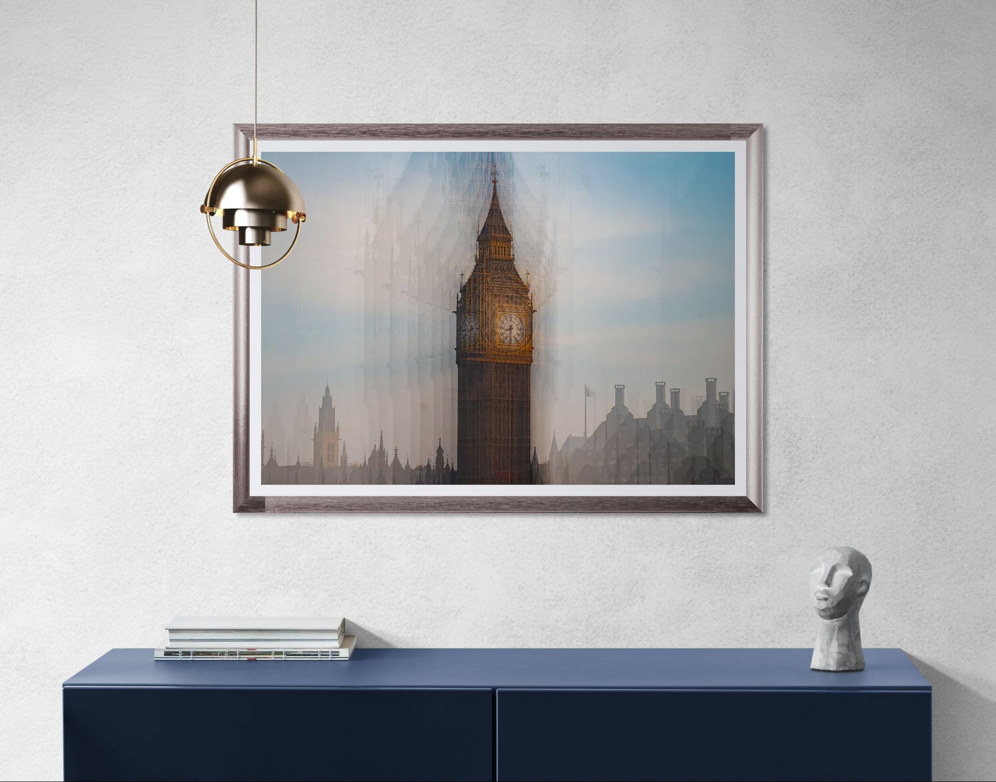 Mega Ben is the most complex and intricate image in The Ben Series, amplifying the grandeur and scale of Big Ben through a powerful and dynamic composition. Standing before the clock tower, I was struck by its imposing structure and the sense of timelessness it exudes. Using advanced techniques that enhance the scale and impact of the tower, I aimed to convey its monumental presence and the intricate details of its architecture. The dramatic use of light and shadow highlights the clock face and the tower's ornate design, creating a sense of awe and reverence. Mega Ben encourages viewers to appreciate the iconic landmark's role as a guardian of time in the heart of London and its significance in the city's heritage.