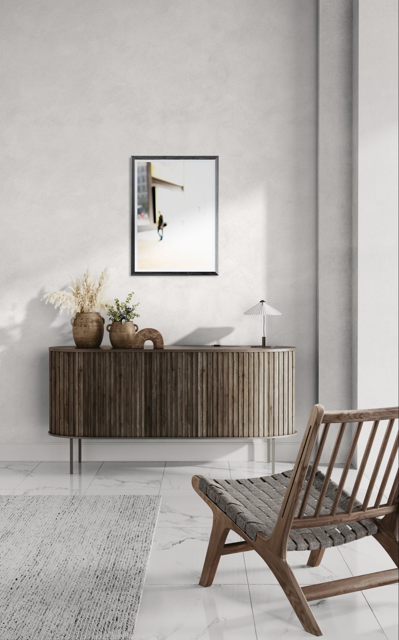 Single Man features the solitary figure of a single man walking through the vibrant streets of Fenchurch. This piece from the Fenchurch collection uses overexposure to highlight the contrast between the individual's focused stride and the bustling urban surroundings. As I watched him, I sensed a story behind his introspective journey, a personal world amidst the city's chaos. The bright light creates an almost ghostly aura around the man, emphasizing his solitude and contemplative state. The dynamic composition and interplay of light and shadow convey a sense of isolation and introspection, making me wonder about the thoughts and experiences that shaped his path.